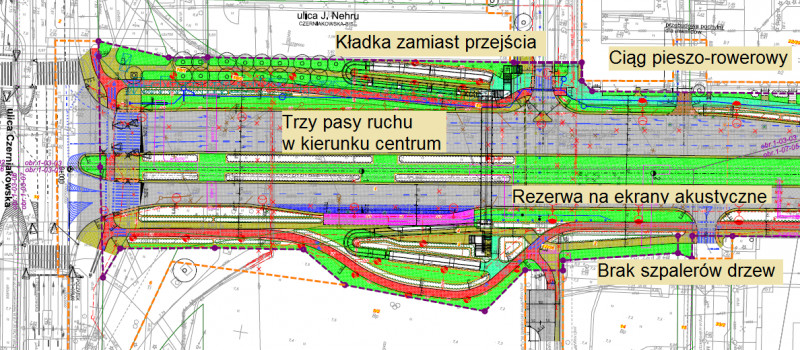 Niektóre problematyczne aspekty obecnego projektu - odcinek przed skrzyżowaniem z Czerniakowską.
