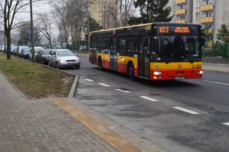 Bielany-Ratusz 04 (ul. Jarzębskiego, szeroka jezdnia wykorzystywana do parkowania równoległego jak na ul. Mickiewicza, wiata i inne akcesoria zajmują większą część zwężonego chodnika),