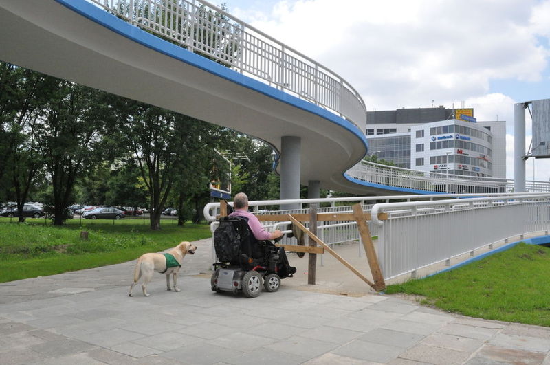 Udało nam się także odwiedzić kładkę przy ulicy Ostrobramskiej, w okolicach ulicy Grenadierów. Ta jeszcze nie jest gotowa. Mam jednak nieodparte wrażenie, że betonowe pochylnie okażą się mniej podatne na dewastacje, awarie i zalanie wodą niż podnośniki.