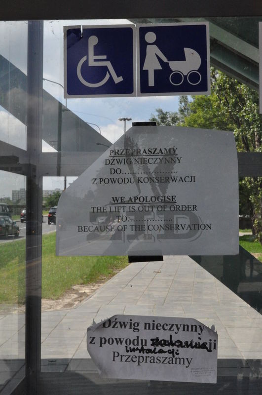 ZDM powiesił tu już kartki na każdą okazję. Przyczyną nieczynnego dźwigu jest więc albo dewastacja (skreślona), albo zalanie instalacji (namazane markerem), albo trwająca konserwacja (na drugiej kartce). Przechodząca obok starsza pani na widok aparatów zaczęła się żalić, że taki stan trwa tu od Wielkiejnocy.