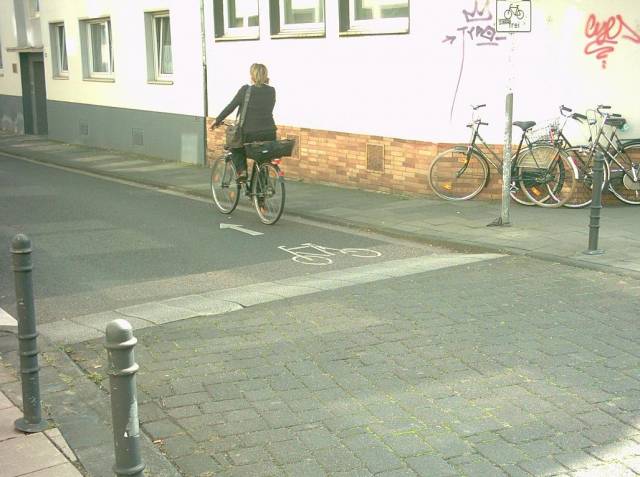 Jednym ze sposobów uspokojenia ruchu są podniesione tarcze skrzyżowań (na zdjęciu widoczna jedna z odnóg skrzyżowania).