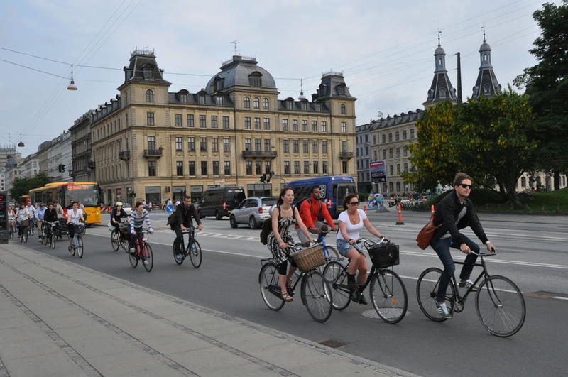 Przywilej taki rowerzyści mają na kilku najbardziej ruchliwych ulicach w mieście. Np. tą ulicą [zobacz >>>] przejeżdża w ciągu dobry nawet 35 tysięcy rowerów. Gdyby cykliści ci mieli tu jechać samochodami, z pewnością zakorkowaliby doszczętnie oddane im do dyspozycji dwa jednokierunkowe pasy rowerowe o szerokości 4 m każdy.
