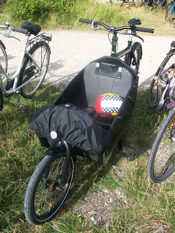 Nieco rzadziej widzi się dzieci wożone w rowerze typu Bullit. Jest to dwukołowy rower z przednim pojemnikiem, który, tak jak na zdjęciu, może mieć specjalnie siedzenie dla dziecka lub być używany jako rower czysto towarowy.