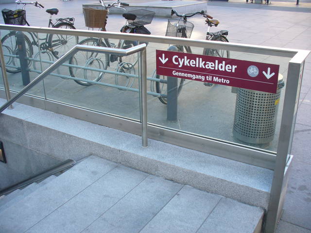 Przy wejściu na stację metra oznakowanie kieruje rowerzystów do Piwnicy rowerowej (cykelkælder). Oczywiście, stojaki umieszczono także na zewnątrz, w bezpośredniej bliskości schodów.
