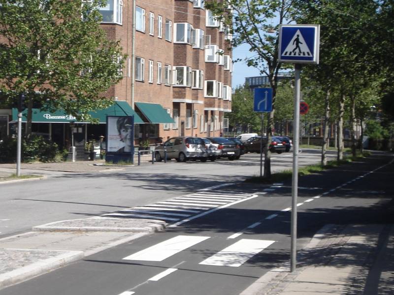 Niektóre przejścia dla pieszych są oznakowane, także te na drogach dla rowerów. W nocy znaki są podświetlane, aby wskazać rowerzyście, gdzie powinien zachować szczególną ostrożność.