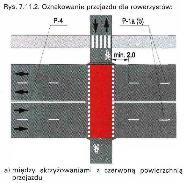 Konieczność barwienia na czerwono całej ścieżki jest mitem. Świadczy o tym dobitnie ten fragment jednego z załączników do Rozporządzenia Ministra Infrastruktury z 3 lipca 2003 r. w sprawie szczegółowych warunków technicznych dla znaków i sygnałów drogowych oraz urządzeń bezpieczeństwa ruchu drogowego i warunków ich umieszczania na drogach.