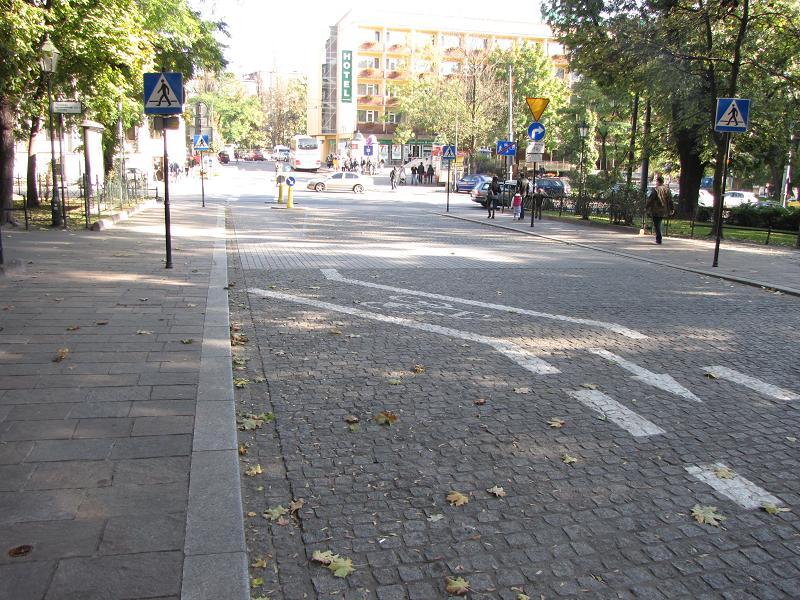 Zbliżenie na wysepkę. Po prawej widać nakaz skrętu w prawo, który oczywiście nie dotyczy rowerów.