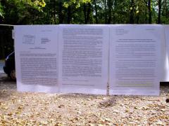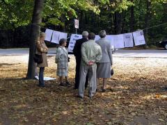 Przy drodze na przystanek tramwajowy wyeksponowane zostały korespondencja i ekspertyzy związane z ochroną Lasu Bielańskiego.
