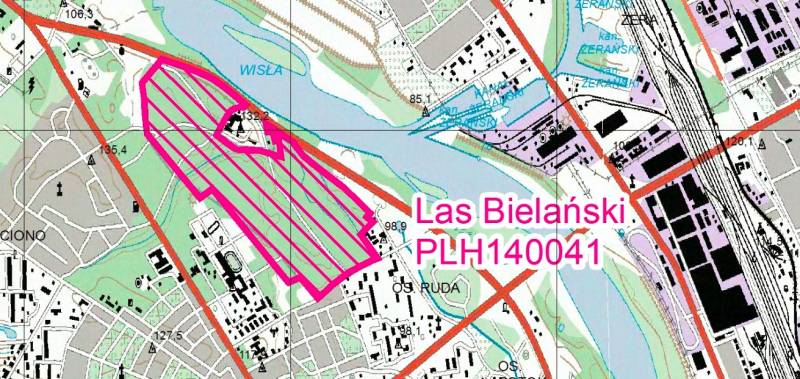 Fragment oficjalnej mapy z konturem obszaru Natura 2000 PLH 140041 Las Bielański.