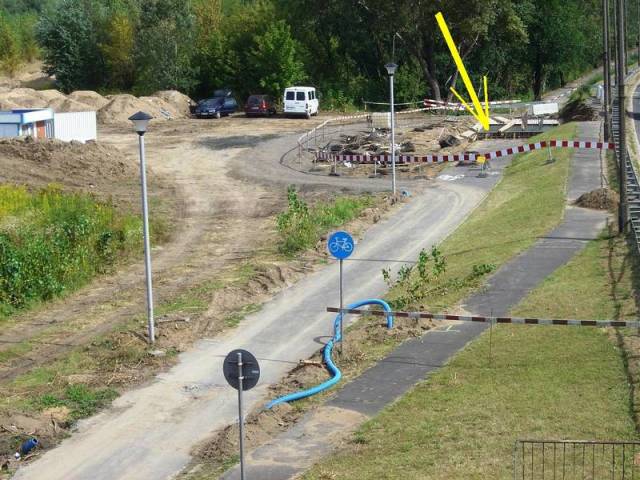Oto te same dwie okopane latarnie widoczne wyżej na zdjęciu z końca sierpnia. Żółta strzałka wskazuje zbrojenie fundamentu przyczółka przyszłej kładki.