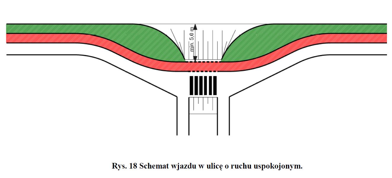 Przykład ignorowanego przez projektantów bardzo istotnego zalecenia w p. 5.1.24 Standardów Na skrzyżowaniach dróg, gdy na drodze z pierwszeństwem przejazdu występuje ścieżka rowerowa, a droga podporządkowana stanowi wjazd do strefy ruchu uspokojonego z ruchem rowerowym odbywającym się na jezdni, na drodze podporządkowanej zaleca się zastosowanie konstrukcji wjazdu bramowego (...). Przejazd i przejście powinny być w poziomie dróg dla rowerów i ciągów pieszych przebiegających wzdłuż drogi z pierwszeństwem przejazdu. Szczegóły rozwiązania przedstawia rys. 18.
