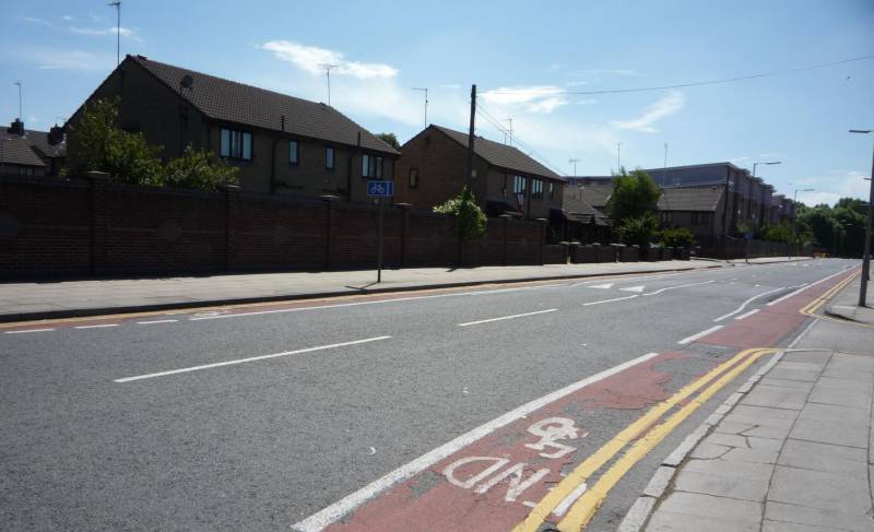 Żadne z tych rozwiązań poza tradycyjnym progiem spowalniającym nie utrudnia ruchu rowerom. Jednak również zwykłe progi można dostosować do ruchu rowerowego, skracając je po bokach (widoczne za wyjazdem z ulicy). Jak widać, Anglicy są świadomi, że rowerzyści nie mają predyspozycji do znaczącego przekraczania prędkości powyżej 30km/h. Na zdjęciu widać też normalne wyłukowanie wyjazdu z ulicy lokalnej. Nie wszystko musi być dostosowane do ruchu TIR-ów, a mniejsze łuki również pełnią funkcję uspokojenia ruchu (i vice versa - większe łuki prowokują niebezpieczne zachowania).