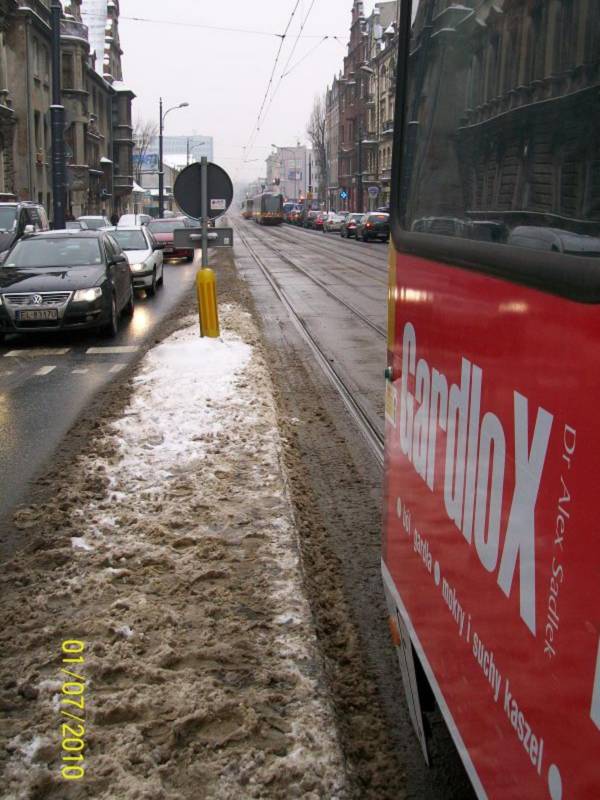Na południowym fragmencie ulicy Piotrkowskiej z utrzymanym ruchem samochodów tramwaje po modernizacji torowiska kursują środkiem jezdni na wydzielonym pasie.