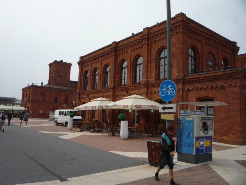 Również na placach Manufaktury dopuszczony jest ruch rowerowy (choć dobór oznakowania jest nieco nietypowy).