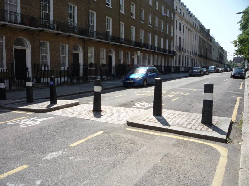 Na ulicy, gdzie występuje parkowanie na większą skalę, widoczne jest też wyraźne oznakowanie przepustu dla rowerzystów, by nie został on zastawiony.
