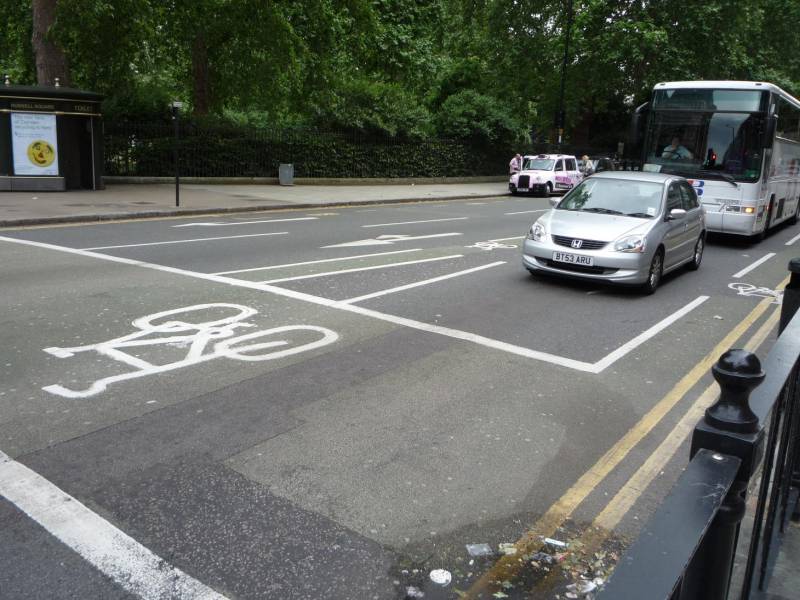 Na większych ulicach możliwe jest prowadzenie osobnych pasów dla rowerów do różnych części śluzy (w tym wypadku wzdłuż pasa do jazdy na wprost i wzdłuż pasa do prawoskrętu).