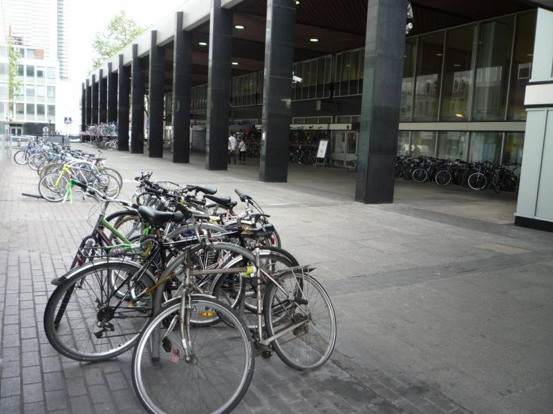 Przy dworcu potrzebne jest dużo miejsc parkingowych. Dla rowerów, rzecz jasna. Na drugim planie zadaszone (a w głębi dwupiętrowe) parkingi rowerowe, na pierwszym dodatkowe miejsca dla tych, którzy nie zmieścili się pod dachem.
