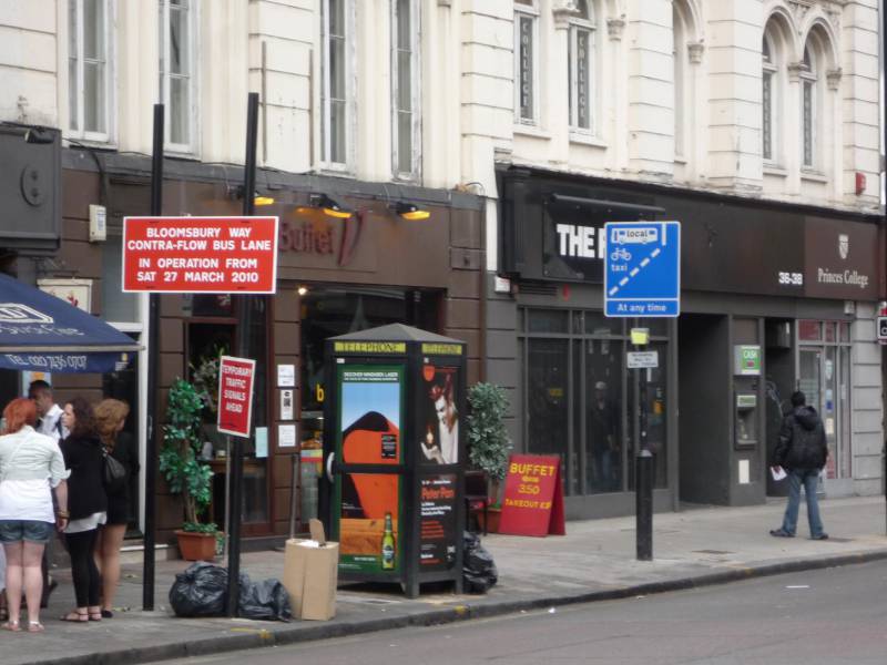 Zbliżenie na oznakowanie pionowe. Na całodobowym kontrapasie autobusowo-rowerowym dopuszczony jest ruch jedynie autobusów miejskich, taksówek i rowerów.