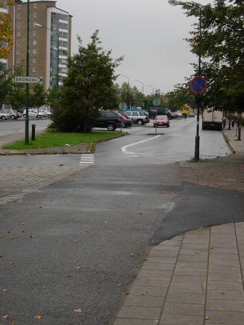 Włączenie ruchu rowerowego z uliczki parkingowej w ścieżkę. Warto zwrócić uwagę na geometrię uniemożliwiającą samochodom wjazd na parking z dużą prędkością.