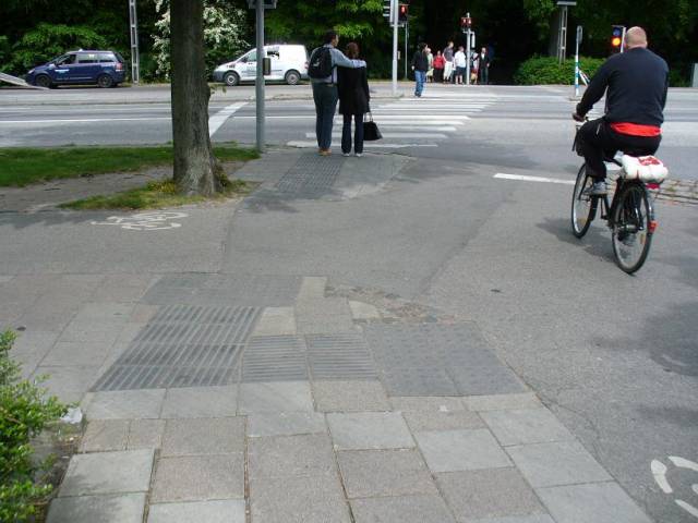 Spotkanie ścieżki z ciągiem pieszym. Płytki rowkowane naprowadzają laskę ewentualnego niewidomego na możliwe kierunki poruszania się. Płytki z wypustkami oznaczają zatrzymanie, nie tylko przed jezdnią, ale także ścieżką. Nie zakłada się przy tym, że osoba niewidoma zobaczy te płytki, stąd ich kolor nie kontrastuje z podłożem.
