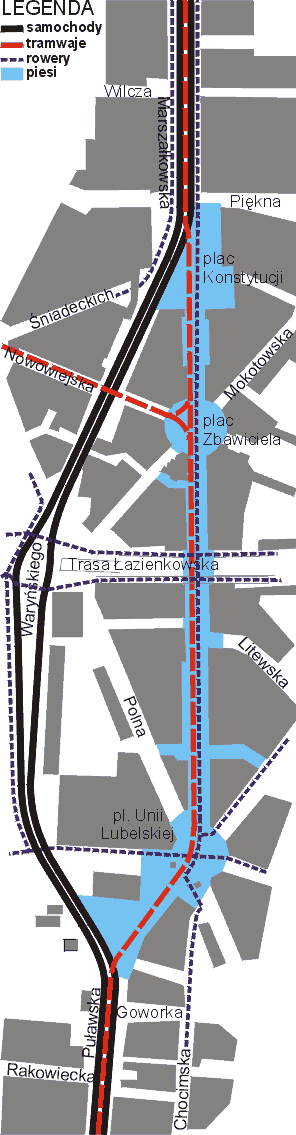 Uważamy, że Marszałkowska na odcinku od pl. Unii Lubelskiej do pl. Konstytucji powinna zostać wyłączona z ruchu samochodowego i zamieniona w atrakcyjny trakt pieszo - tramwajowo - rowerowy. Stwórzmy ulicę na miarę stolicy europejskiego kraju. Niech Marszałkowska będzie wizytówką Warszawy jak w innych miastach Piotrkowska, Planty czy Krupówki.