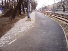 Tramwaje Warszawskie w budowaniu infrastruktury rowerowej dopiero się wprawiają [zobacz >>>], więc dały sobie wmówić powyższe zobowiązania. Tymczasem doskonale widać na przykładzie fragmentów omawianej inwestycji leżących w gestii ZDM, że ani oddzielenie ścieżki rowerowej od chodnika, ani przesunięcie kolidujących słupów trakcyjnych nie jest konieczne. Cóż to za wyzwanie zbudować drogę rowerową zgodnie z zasadami sztuki i potrzebami użytkownika? Słupów trakcyjnych nie należy przesuwać, każdy z nich to okazja do urozmaicenia efektów inwestycji.
