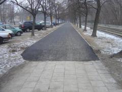 Jednak kawałek dalej, za przystankiem przy Twardowskiej udało się wylać asfalt - aż do przystanku przy Szpitalu Bielańskim. Taki widok - choć w czarnych barwach - cieszy, a jednocześnie budzi obawy - czy zachęcających warunków ruchu nie zniweczy oznakowanie C-16/13...