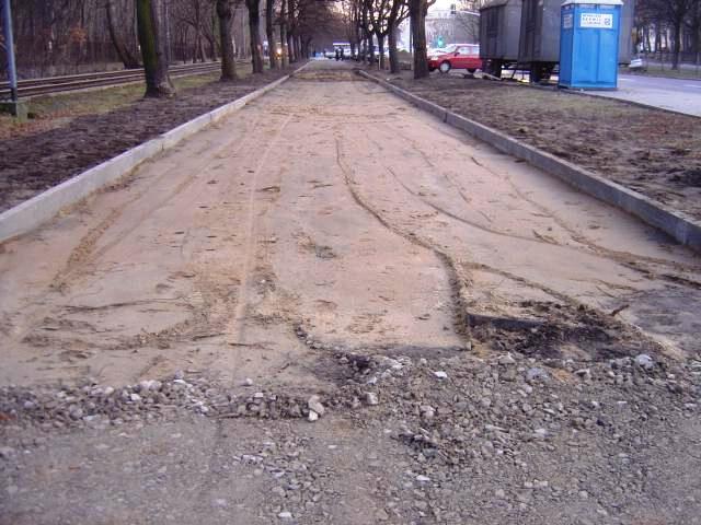 Między Szpitalem a ul.Dewajtis przygotowano koryto, w połowie wypełnione już solidną podbudową z kruszywa. O jakość nawierzchni na prostym odcinku możemy być raczej spokojni.