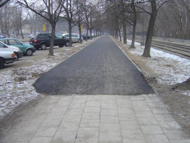 Jednak kawałek dalej, za przystankiem przy Twardowskiej udało się wylać asfalt - aż do przystanku przy Szpitalu Bielańskim. Taki widok - choć w czarnych barwach - cieszy, a jednocześnie budzi obawy - czy zachęcających warunków ruchu nie zniweczy oznakowanie C-16/13...