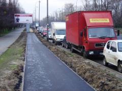Choć od 25 kwietnia 2007 r. zarządzenie w sprawie tworzenia warunków dla komunikacji rowerowej [zobacz >>>] nakazuje budowę dróg dla rowerów w technologii nawierzchni asfaltowej, mieliśmy sporo obaw, czy ZDM weźmie sobie ten zapis do serca. Dziś prezentujemy namacalny dowód, że w/w zarządzenie zaczęło obowiązywać. Od paru dni na ul. Marymonckiej trwają prace przy budowie pierwszej od czasu jego wejścia w życie ścieżki o asfaltowej nawierzchni.