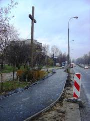 Ktoś zdecydował, że ścieżka ominie krzyż przydrożny. Może św. Krzysztof będzie strzegł rowerzystów przed uszczerbkiem na zdrowiu, dopóki nie zatroszczą się o to urzędnicy tworząc bezpieczną infrastrukturę...