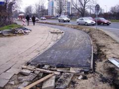 Północny odcinek - koryto przygotowane do wysypania podbudowy już czeka. Po lewej pryzmy kostki, która nie zdążyła tu długo poleżeć. Gdzie teraz trafi? Czy ktoś zastanowi się nad marnotrawnym remontowaniem chodników bez jednoczesnego wytyczania na nich dróg dla rowerów?
