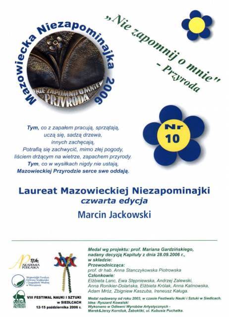 Medal przyznany został decyzją Kapituły pracującej pod przewodnictwem prof. dr hab. Anny Stańczykowskiej - Piotrowskiej, za aktywność w działaniach stowarzyszenia i walkę o zachowanie dla potomności Lasu Bielańskiego.