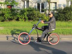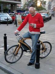 Pan na drewnianym rowerze.