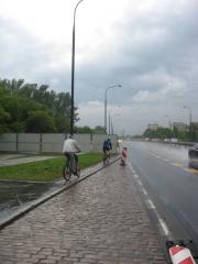 Na Modlińskiej drogowcy kontynuują zainicjowaną na Wisłostradzie tradycję prowadzenia ruchu rowerowego pod prąd jezdnią dróg klasy GP [zobacz >>>]. Szkoda, że tak trudno ich namówić na dopuszczenie ruchu rowerowego pod prąd na ulicach lokalnych, na których samochody jeżdżą 4 razy wolniej i 40 razy rzadziej [zobacz >>>].