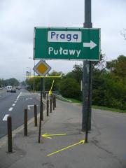 1/ proszę o usunięcie poza skrajnię lub odpowiednie oznakowanie elementów wygrodzeń i murów oporowych, znajdujących się w świetle ciągu pieszo - rowerowego. Zrozumiałe jest, że ciąg ten stanowi prowizorkę i nie może mieć przepisowej szerokości, co nie znaczy automatycznie, że można zrezygnować z przestrzegania pozostałych zasad
