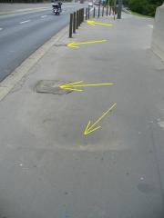 - wpustów z obluzowaną kratą, emitujących dokuczliwy dźwięk stukania i brzęczenia (np. wpust na wysokości okien budynku naprzeciwko przystanku autobusowego w stronę Saskiej Kępy, oznaczony jako 3.)