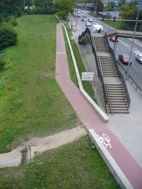 uprzejmie proszę o dokonanie przeglądu przebiegu drogi dla rowerów wzdłuż Wisłostrady na wysokości Mostu Poniatowskiego i usunięcie nieprawidłowości w postaci niewidocznych znaków P-10 na przejściach przez tę drogę, jak też braku odpowiedniego oznakowania obiektów w jej skrajni.