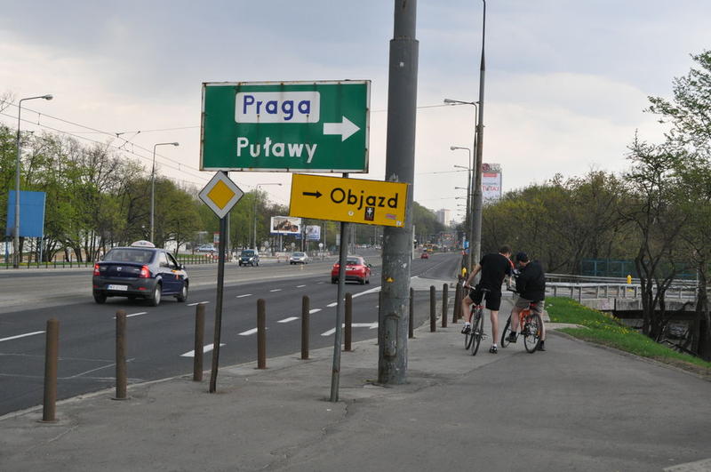 Co więcej, nieprawidłowość ta była już raz do ZDM zgłaszana [zobacz >>>]. Co się zmieniło w tym miejscu w stosunku do września 2009 roku? Dodano nową tabliczkę informującą o objeździe, która także wisi niezgodnie z przepisami.