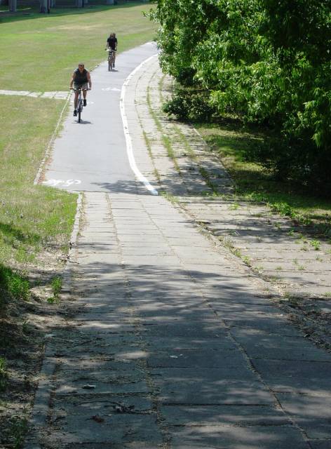 d. Bielany, zjazd ścieżki z korony wału pod trasę AK skrajem działek - stromy i zbyt wąski (przekwalifikowano stary chodnik bez poszerzenia, czego wymaga przy dużym ruchu i nachyleniu)