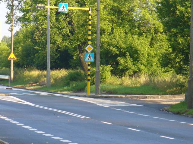 1.Na środku wąskiego chodnika postawiono gruby słup wspornika lampy oświetlającej przejście. Słup ten tarasuje chodnik i zmusza pieszych do wchodzenia na jezdnię w miejscu niebezpiecznym i w sposób trudny do przewidzenia dla kierujących samochodami.