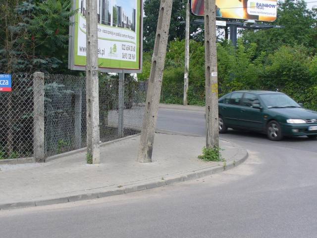 Symetrycznie po obu stronach skrzyżowania chodnik zatarasowany jest odpowiednio: słupem energetycznym dwunożnym i pojedynczym słupem telefonicznym...