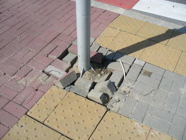 8. Nawierzchnia wokół jednego z sygnalizatorów jest uszkodzona, prawdopodobnie zaniedbano jej naprawę po czynnościach naprawczych;