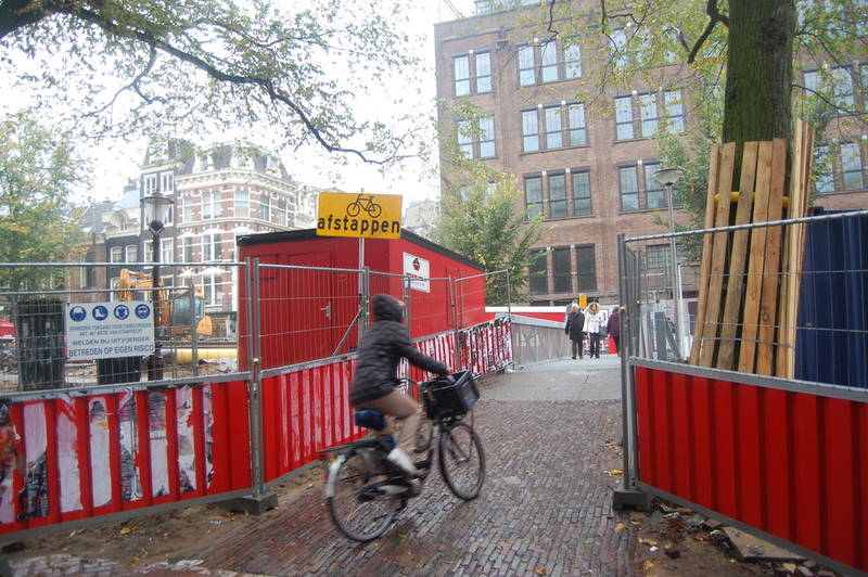 Amsterdam to przede wszystkim kanały, a więc i mostki na nich. Na czas ich remontów zazwyczaj układane są tymczasowe kładki. Po tej akurat nie wolno jeździć rowerem. Tu Amsterdam akurat nie różni się od Warszawy - drogowcy na całym świecie myślą, że nawet najgłupszy zakaz bez dania rowerzystom alternatywnej drogi przejazdu będzie respektowany ;-)