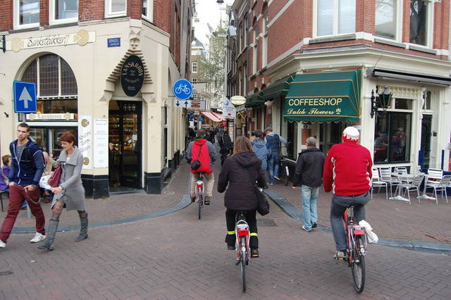 Rowerowe ulice, choć nieco innego typu, stosuje się też w Holandii. Ta, jak widać, jest na starówce w Amsterdamie.