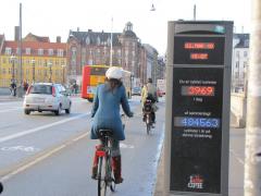 Na moście obok wydzielonych ścieżek rowerowych wyznaczono pasy rowerowe na jezdni. Zwężono w ten sposób przekrój dla samochodów z czterech do dwóch pasów ruchu, ograniczając dopływ samochodów do ścisłego śródmieścia. O duńskich licznikach rowerzystów - takich jak widoczny na pierwszym planie - napiszemy jeszcze więcej w odrębnym materiale.