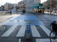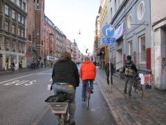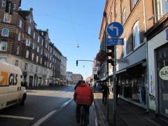 Ulice lokalne - np. widoczna na zdjęciu Frederik VII's Gade - włączone są w zbiorczą Nørrebrogade bez żadnych wyłukowań i z zachowaniem ciągłości chodnika wzdłuż ulicy zbiorczej. Ale to akurat było ,,od zawsze''. Minus za wyrwikółki.
