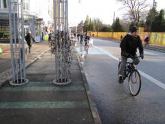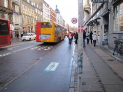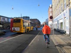 Wycieczkę zaczynamy na skrzyżowaniu z Søtorvet, tuż przed wjazdem na most Dronning Luises Bro (widok w kierunku śródmieścia, kolejne zdjęcia będą już w kierunku granicy miasta). Jak widać na zdjęciu, jest to ważna arteria zarówno dla komunikacji rowerowej jak i autobusowej.