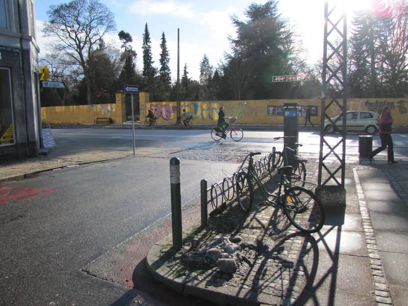Ulice lokalne - np. widoczna na zdjęciu Frederik VII's Gade - włączone są w zbiorczą Nørrebrogade bez żadnych wyłukowań i z zachowaniem ciągłości chodnika wzdłuż ulicy zbiorczej. Ale to akurat było ,,od zawsze''. Minus za wyrwikółki.