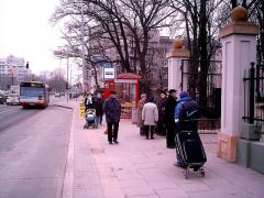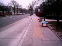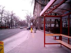 Pierwsza z nich wydaje się potrzebna, wszak na przystanku zatrzymuje się kilka linii autobusowych (107, 122, 172, 505, N37). Jednak przystanek z zatoką, wiatą, słupkiem i śmietnikiem pojawił się w miejscu, gdzie miesza się kilka rodzajów ruchu pieszego: oczekujący na autobus (a od czasu do czasu wsiadający /wysiadający), przechodzący mimo przystanku i wchodzący do parku. Na zdjęciu widać, że bardziej niż zatoka przydałoby się im więcej przestrzeni.